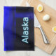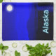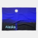Moonrise in der Innenstadt von Alaska. Berge in der Ferne und ein Fischerboot fährt nach Norden. Der Text "Alaska" erscheint in leuchtendem Blau und Weiß.