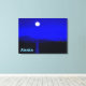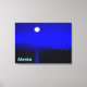 Moonrise in der Innenstadt von Alaska. Berge in der Ferne und ein Fischerboot fährt nach Norden. Es erscheint auch das Textlesen "Alaska".