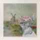 Die wunderschöne und künstlerische Zusammenstellung zeigt Claude Monets CHAMP TULIPES EN HOLLANDE als Hintergrund mit dem Portrait der grauen Katze mit dem blühenden Aquarell-Overlay.