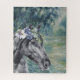 Das wunderschöne und künstlerische Rätsel zeigt Claude Monets Morning an der Seine als Hintergrund mit einem Portrait von schwarzem Pferd mit Aquarellblumen-Overlay.