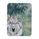 Die schöne und künstlerische Zusammenstellung zeigt Claude Monets Morning an der Seine als Hintergrund mit dem Portrait des grauen Wolfs mit blühenden Wasserfarben-Kronen-Overlay.