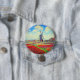 Button mit Claude Monets Blume und Windmühle Malerei. Schöne und farbenfrohe Felder mit roten, rosa und gelben Tulpen neben einer Windmühle und einem Haus in Holland. Ein großartiges Monetgeschenk für Fans von Impressionismus und französischer Kunst.