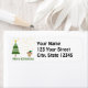 Niedlicher Affe mit einem roten und grünen Weihnachtselfenhut in einer sternigen Nacht neben einem festlich dekorierten Baum. Frohe Weihnachten!
