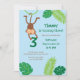 Cette invitation d’anniversaire mignonne et colorée est idéale pour célébrer le troisième anniversaire de votre fils. Il comporte un personnage de singe accroché à un brach et portant le numéro d'anniversaire. Les Feuilles décorent la frontière. Ce design ludique est parfait pour un enfant actif qui aime s'amuser.