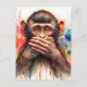 Diese Postkarte zeigt farbenfrohe Aquarellbilder eines Affen, der seinen Mund in der Geste "Sprich no Böse" bedeckt. Der niedliche Simian starrt direkt auf den Betrachter, gemalt in einem mehrfarbigen Tropfen und Spritzer Stil. Ideal für diejenigen, die Schimpansen und symbolische Kunst Liebe!