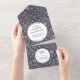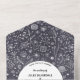 Feine botanische Blume in Weiß auf dunkelgrauem Kalkboard-Hintergrund für ein modernes Blumenambiente. Eine wunderbare Koordination in einer Einladung, die Sie zum Anzug Ihrer Feier ändern können. Der untere Teil kann per Post auf R.S.V.P. abgerissen werden.