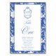 Delft blue floral table number card, designed in a refined blend of chinoiserie and French toile de Jouy style. The soft botanical illustrations frame an arched layout featuring an elegant wedding crest monogram, perfect for couples who love vintage, historic, and European-inspired aesthetics. Classic script typography pairs beautifully with the ceramic-blue palette, making this design an effortless nod to the tradition of “something blue.” Fully customizable with your guests names, wedding crest and in this design table number: One, it’s an exquisite choice for any romantic or sophisticated wedding theme.