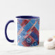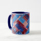 Individueller Mug mit eigenem Monogramm (optional) auf einem gemusterten Patchwork oder Quilting-Design mit blauer Jeans. Unter dem Monogramm befindet sich eine benutzerdefinierte Kreisform. Sie können auch ein Rechteck auswählen, wenn Sie längere Texte hinzufügen möchten.