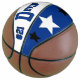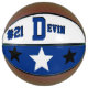 Es handelt sich um einen Basketball in voller Größe mit zwei Panels, die mit einem Monogramm-Namen (großer erster Buchstabe) und einer einheitlichen Zahl in beliebten Unis gestaltet wurden. Dieses hier ist in blau, weiß und schwarz dargestellt. Das zweite Panel hat Teamfarben mit drei Sternen. Text, Kunst und Farben können nach Belieben entfernt oder geändert werden. Eine Kontrollleiste kann für Autogramme, usw. weiß verlassen werden.