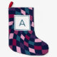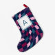 Monogram Bold Checkered Pattern Kleine Weihnachtsfeier Strumpf. Farben in blau, aquamarin, lila und pinkt. Personalisieren Sie die Vorlage mit dem ersten Monogramm. Doppelseitiges Design. © Kimbellished, LLC