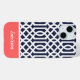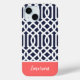 Stilvolle, individuelle Telefonzelle in marineblau, korallenblau und weiß. Dieses Design zeichnet sich durch ein prächtiges marokkanisches Trellis-Muster aus. Personalisieren Sie es mit Ihrem Namen oder anderen benutzerdefinierten Text in einem modernen Script Monogramm Schriftart. Verwenden Sie die Designtools, um Hintergrundfarben auszuwählen, Schriftart und Farben zu bearbeiten und eigene Fotos hochzuladen, um ein einzigartiges Geräusch zu erstellen!