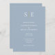 Diese schicke, minimalistische, staubige blaue Hochzeitseinladung kann mit Ihren Monogramm-Initialen und den Informationen zum Hochzeitstag personalisiert werden. Mit Ihren Hochzeitswebsite-Details und Ihrem QR-Code auf der Rückseite. Entwickelt von Thisisnotme©