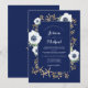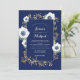Weiße anemonische Blume mit goldenen Zweigen und Blätter, die einen schönen Rahmen bilden. (Gold ist kein echtes Gold, sondern gedruckt.) Navy Hintergrund. Bride und Groom's Monogramme mit goldenen Blätter. Schlichtes und modernes Hochzeitsdesign.