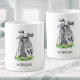 This classic ceramic mug features a stylish gray watercolor golf bag filled with clubs, surrounded by a touch of green grass. The design is printed on both sides of the mug for easy viewing whether you’re left- or right-handed. A simple serif font initial monogram is placed directly on the golf bag, blending seamlessly into the artwork. Below the monogram, the full name is displayed in a matching serif font for a clean and personalized touch. The monogram is currently in a dark gray, almost black, to match the bag’s accents, but you can customize it to any color you prefer.