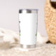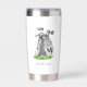 This elegant travel mug features a stylish gray watercolor golf bag filled with clubs, surrounded by a touch of green grass. The design appears on both sides of the mug for easy viewing. A simple serif font initial monogram is placed directly on the golf bag, blending seamlessly into the overall design. Below the monogram, the full name is displayed in a matching serif font for a classic and personalized touch. The monogram is currently in a dark gray, almost black, to match the bag's accents, but it can be customized to any color you prefer.
