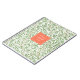 Schönes Grünmuster von William Morris. Grün und braun, weißer Hintergrund, orangefarbener Schild mit Monogramm und individuelle Name. Elegant und raffiniert.