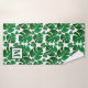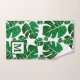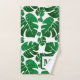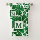 Tropische Badehandtücher aus Monogramm. Die tropischen Blätter der Monstera Pflanze sind grün und weiß, mit einem monogramm Handtuchhandtuch Set.