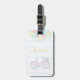 Monogram Modern Blume Bike Gepäckträger Tag. Vorderseite: rosa Fahrrad mit Blumenkorb. Blume, Beeren und Blätter (rosa, blau, türkis, goldfarben). Goldener individuelle Name. Hellblaue Streifen. Rückseite: blaue Streifen, Blume, benutzerdefinierte Telefonnummer. Modern, niedlich und romantisch.