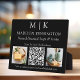 Modernes Minimalistisches Business Plaque Tabletop Schild mit 2 Fotos. Schwarz & Weiß oder wählen Sie Ihre eigenen Farben. Fügen Sie dem QR Scan Code Ihre Website oder Web-Adresse für Social Media hinzu. Ermöglicht den Kunden, die Prüfung zu verwenden, um auf Informationen zu Ihren Produkten wie Produkten oder Menüelementen zuzugreifen. Ideal für Einzelhändler, kleine Geschäfte, kleine Kioske, Messen und Events, Gastfreundschaft, Salons, Wellness-Center, Bäckereien, Cafés, Restaurants, Bars und vieles mehr. Einfach mit Ihren Monogramm-Initialen, Firmennamen und Informationen, Fotos, Slogan oder sogar mit Ihrem Logo oder persönlichem Markendesign personalisieren.