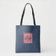 Trendy dark denim print shoulder tote bag with a red and white gingham check framed monogram square. Easily change the dark blue initials and minimalist quote on back using the Template provided. Dimensions are 16" x 16" with a 28" black strap; an 18" bag is also offered. The exterior is 100% sturdy brushed polyester; interior is 100% polyester nonwoven laminate. Printed and then sewn for edge-to-edge designs. See "About" for additional information and care. Made in the USA.