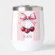 Ein rosafarbener Bogen mit Kirschen, ein ästhetischer, thermaler Weinschmeichler mit rosa und weißen Streifen im Hintergrund. Großartiges Geschenk für Brautmädchen, Frauen. Monogramm mit ihrem Namen oder ihren Initialen.