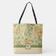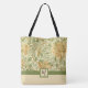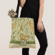 Eine florale Tasche mit einem moosgrünen Band und Quadrat, um Ihr Monogramm hinzuzufügen. Ein Blumenmuster des englischen Künstlers William Morris (1834-1896), genannt Honeysuckle (um 1885), eine feine, wilde Honeysuckle-Rasse mit orangefarbenen Blume und üppig grünem Blattwerk.