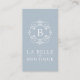 Diese Visitenkarte ist eine europäische inspirierte Visitenkarte in französischer Farbe. Sie ist mit einem handgezeichneten Logo-Scrollrahmen versehen, der Ihr Monogramm umgibt. Es funktioniert gut für eine Boutique, Friseur, Nagelstudio, Wellness-Center, Restaurant, Designer, Modebranche, Schmuckdesigner und andere berufliche Unternehmen. Hinzufügen oder Entfernen von Textzeilen zum Anzug Ihrer Einstellungen. Auf der Rückseite der Karte gibt es genügend Platz, um Ihre Social-Media-Konten einzubinden.