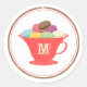 Ein Aufkleber mit einer Vintag inspirierten Abbildung farbiger französischer Macarons in einem zarten roten Teacup. Die Illustration ist von dekorativen braunen und roten Kreisen umgeben. Personalisieren Sie sich mit dem Buchstaben Ihrer ersten.