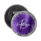Dieser personalisierte Glasflaschenöffner verfügt über ein Monogramm und einen Vornamen in modernem Grauschrift auf einem lila, von silbernen Imitaten gerahmten Metallhintergrund.