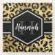 Chic vergoldeter und schwarzer Leopardenprint Untersetzer mit individuelle Name und Monogramm Vorlage. Ein niedlicher und trendiger Safari-Tiermuster-Hintergrund, der mit einem eigenen Stück Personalisierung überragt wird.
