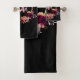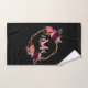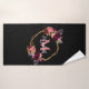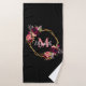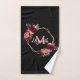 Eine schicke Marine schwarzen Hintergrund. Ein geometrischer Rahmen aus goldenen Imitaten, der mit wasserfarbenen Blume, Rose in Bordeaux, Rosa und Boho-Stilfedern dekoriert ist. Vorlagen für Ihren Namen und Monogramm-Buchstaben. Der Name in Rosa ist mit einem modernen und trendigen Handschrift geschrieben. Der Monogramm-Brief in Korallen.