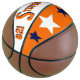 Es handelt sich um einen Basketball in voller Größe mit zwei Panels, die mit einem Monogramm-Namen (großer erster Buchstabe) und einer einheitlichen Zahl in beliebten Unis gestaltet wurden. Dieses hier ist in Blau, Orange und Weiß dargestellt. Das zweite Panel hat Teamfarben mit drei Sternen. Text, Kunst und Farben können nach Belieben entfernt oder geändert werden. Eine Kontrollleiste kann für Autogramme, usw. weiß verlassen werden.