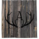 Der Duschvorhang ist mit rustikalem dunklem Holz, schwarzen Antlers und Ihrem Monogramm ausgestattet.