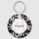 Ein Schlüsselanhänger mit einem eleganten Muster, das mit einer Aquarellbilderung von rosa Blume mit blau-grauen Blätter und Stielen versehen ist. Kleiner schwarzer Hintergrund. Ein weißer Kreis überlagert mit Ihrem Namen und einem Monogramm, das sich im Inneren befindet.