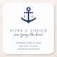 Nautische Save the Date-Untersetzer mit einem marineblauen Anker auf beiden Seiten mit dem Monogramm. Unten sind Ihre Namen und die Worte, "binden den Knoten", über einen weißen Hintergrund. Dieses einfache Design ist ideal für eine Hochzeit am Strand im Sommer.