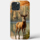 Zwölf Punkte Rack auf einem fabelhaften Hirsch. Das Waldgebiet im Herbst zu überprüfen, da er am Ufer eines kleinen Sees stehend ist.
