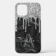 Elegante Girly iPhone 12 Gehäuse mit einem schwarz-silbernen Marmor Hintergrund, silber funkelnden Glitzer-Tropfen, Ihre Initialen, und Name.