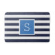 Maßgeschneiderte mit Monogramm Badmatte mit einem prächtigen Streifen in marineblau, blau und weiß. Personalisieren Sie es mit Ihrem Monogramm Initial in einem quadratischen Rahmen. Verwenden Sie die Designwerkzeuge, um Hintergrundfarben auszuwählen, Schriftart und Farben zu bearbeiten und eigene Fotos hinzuzufügen, um ein Design zu erstellen, das jedem Badezimmerdekor entspricht.