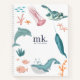 Eine schöne farbenfrohe Aquarell Meerestiere gestalten. Eine Ozeangestalt mit niedlichen Meerestieren wie Schildkröte, Wal, Delfin, Quallen, Fisch, Narwal, Pflanze und Korallen. Ein ideales Design für jeden, der Meerestiere, Aquarellbilder und Ozeandesigns Liebe. Passen Sie das Monogramm an und machen Sie es zu Ihrem eigenen!