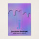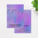 Im Hintergrund unserer irisierenden Folienhaar-Clips sind die Farbtöne Rosa, lila und Blau in einem künstlerisch abstrakten Muster dargestellt... perfekt für Kreative, die Schmuck oder Haaraccessoires als Geschäfts- oder Nebenaufenthalt entwerfen. Holographische metallische Tropfen, die aus demselben Muster stammen, haben eine Prägung, da sie an der Kartenspitze liegen. Die Prägung ist eine grafische Technik, die auf dem Papier gedruckt wird, anstatt ein physikalisches Element zu sein, das auf der Karte überlagert wird. Vor der Karte befinden sich zwei gedruckte Linien, um das Schneiden der Scheiben zu lenken, um die Haarclips zu halten und, darunter, Ihren Firmennamen und Ihre Boutique oder Salon Dienstleistungen. Weitere Details zu Ihrem Unternehmen, wie Telefonnummer, Adresse, E-Mail-Adresse und soziale Mediennamen, können auf der Kartenrückseite personalisiert werden. Ersetzen Sie den Beispieltext einfach durch Ihren eigenen Text auf der Personalisierungsvorlage.