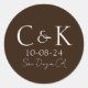 Diese individuellen Hochzeitsaufkleber zeichnen sich durch ein einfaches und modernes Design aus. In der Mitte befinden sich die Beispielmonogramm-Initialen, gefolgt von einem Hochzeitstermin und einem Ort. Der Hintergrund ist dunkelschokoladenbraun.