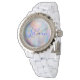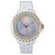 Eine wunderschöne Kristall White Enamel Uhr für Frauen mit Monogramm-Namen in blau auf Perlmutt.