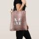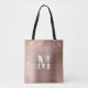 Erstellen Sie Ihre eigene personalisierte Monogramm-Einkaufstasche für eine Brautjungfrau. Rose Gold und rot rosa Ober Farbverlauf farbige Imitate Folie und Glitzer digitale Kunst Grafik. Schwarz-Weiß zeitgenössisches Monogramm mit elegantem Kalligraphiedesign. Sie können den Stil oder die Farbe des Schriftartes nach Ihren Vorstellungen anpassen und ändern. Alle Satin- und funkelnd Glitzer-Effekte werden wie ein Foto auf Ihr Geschenk gedruckt.