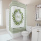 Classic Elegant Style Greenery Wreath personalisiert mit Monogramm und Namen. Weiche grüne Streifen Hintergrund. Perfektes Hochzeitsgeschenk oder Hauswärmeschenk. Sage, Creme, dunkelgrüne Farbpalette.