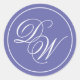 Auf einem violetten (lila) Hintergrund, innerhalb eines weißen Kreises, gibt es ein elegantes Monogramm aus 2 weißen Initialen, die in einem eleganten kalligraphischen Skript geschrieben sind (die Standard-Buchstaben sind D und W). Es kann zum "Abdichten" einer Hochzeitseinladung verwendet werden, mit den Initialen der Braut und Bräutigam, aber auch für gewöhnliche Post, mit den Initialen des Vor- und Nachnamens.