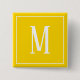Ein quadratischer Knopf mit weißem Monogramm auf goldgelbem Hintergrund. Passen Sie die Schaltfläche mit Ihren eigenen Initialen oder Initialen, Farben, unter anderem. an.