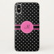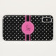 Mit Monogramm schwarz-weißes Polka Punktmuster Case. Weiße Polka-Punkte auf schwarz und in der Mitte ein schwarzes Band mit einem heißen rosa Rahmen und einem heißen rosa Kreis, um Ihr Monogramm hinzuzufügen.