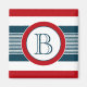 Nautisches Design mit Monogramm-Dekoration in runder Form auf blau, weiß und rot gestreiftem Hintergrund
