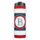 Nautisches Design mit Monogramm-Dekoration in runder Form auf blau, weiß und rot gestreiftem Hintergrund