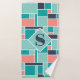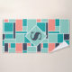 Un design géométrique, audacieux et frais, avec des carrés et des rectangles dans différentes nuances de menthe et de vert turquoise, de rose corail et de bleu foncé. Le monogramme se trouve au centre sur un diamant clair de couleur turquoise. Personnalisez les serviettes de bain et faites-les vous-mêmes. Vous pouvez changer la couleur du diamant et du monogramme si vous voulez un look plus contrasté.